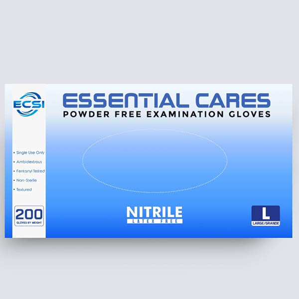 Handle with Care, Essential Cares.\Introducing the Nitrile Glove Powder-Free Finger Textured Blue from Essential Cares Supplies, Inc. Designed for those who demand the highest level of protection and comfort, these gloves are perfect for medical and professional settings. Crafted from high-quality nitrile, they are latex-free, ensuring a safe experience for everyone. With a beaded cuff and textured fingertips, these gloves offer superior grip and dexterity. Tested for chemo and fentanyl protection, they provide an extra layer of security. At 9.6 inches in length and in a vibrant blue color, these large-sized gloves are non-sterile and come in a convenient pack of 200 pieces per box. Experience the unmatched quality and reliability of Essential Cares Supplies, Inc., and never settle for less in your essential care needs.
